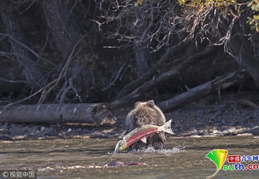 2018年10月29日訊(具體拍攝時(shí)間不詳),加拿大英屬哥倫比亞,一只15個(gè)月大的棕熊幼崽在Chilko Lake湖畔成功捉到一只4公斤重的紅色鮭魚。