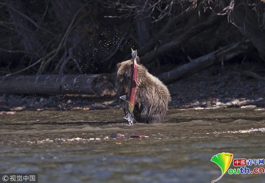 北極熊媽媽帶幼崽覓食 熊寶寶抱“大骨棒”擺拍