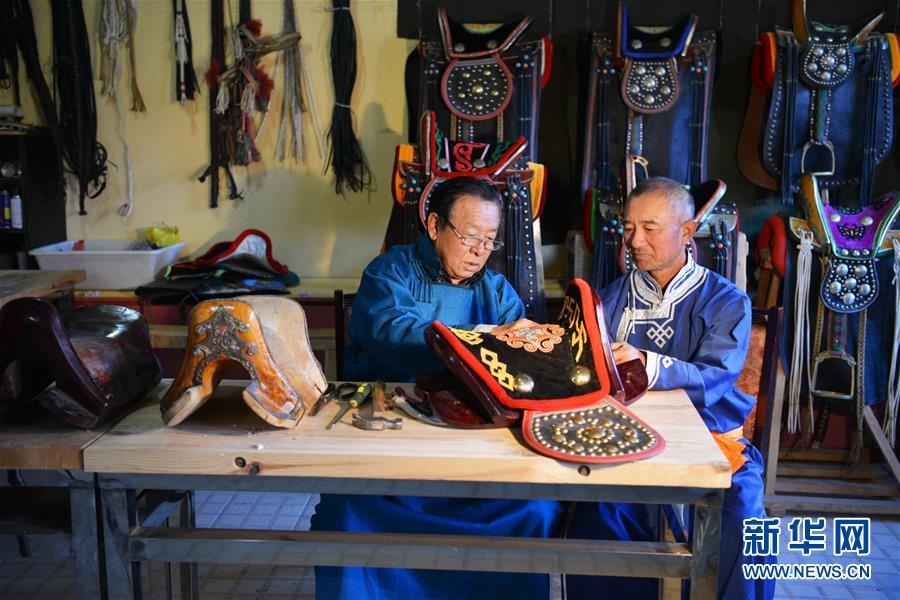 10月31日,在內蒙古自治區(qū)通遼市科爾沁左翼后旗,套格敦白乙(左)向徒弟關嘎扎布傳授制作馬鞍的技巧。新華社記者鄒予攝