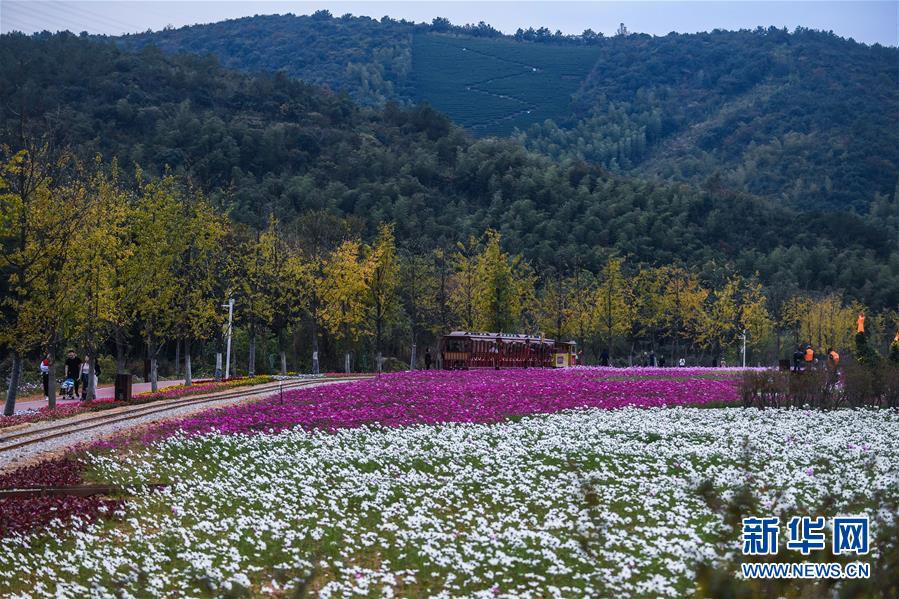 11月2日,游客乘坐觀光小火車觀賞“五彩花?!保o人機(jī)拍攝)。