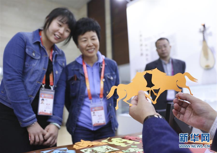 11月4日,在首屆中國國際進(jìn)口博覽會新聞中心,媒體記者觀看中國傳統(tǒng)剪紙技藝展示。 新華社記者蘭紅光攝