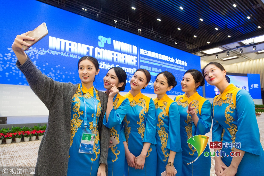2016年11月16日,浙江烏鎮(zhèn),第三屆世界互聯(lián)網(wǎng)大會首日,身著群青鸞鳳刺繡旗袍的大學生禮儀賣萌自拍,成為會議間隙的一道風景。