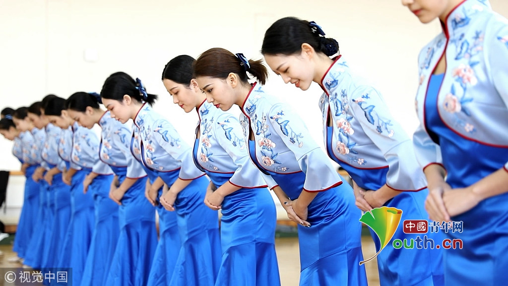 2018年10月15日,杭州,第五屆世界互聯(lián)網(wǎng)大會召開在即,來自浙江傳媒學院的禮儀志愿者們正在進行緊張有序的集中訓練。圖片作者:浙江日報 馮賀/視覺中國