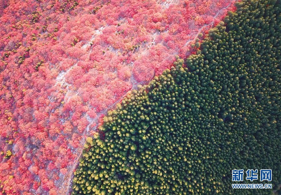 深秋時(shí)節(jié),山東濟(jì)南楔子山山脊兩邊種植的植被形成“一山雙色”景觀(guān),令人稱(chēng)奇。