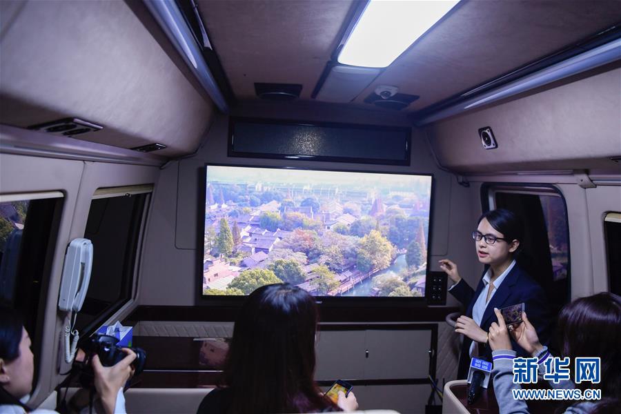 在浙江移動烏鎮(zhèn)分水墩營業(yè)廳外,工作人員在一輛體驗巴士內(nèi)介紹通過5G移動傳輸技術實現(xiàn)的8K高清的視頻畫面實時展示(10月30日攝)。 新華社記者黃宗治攝