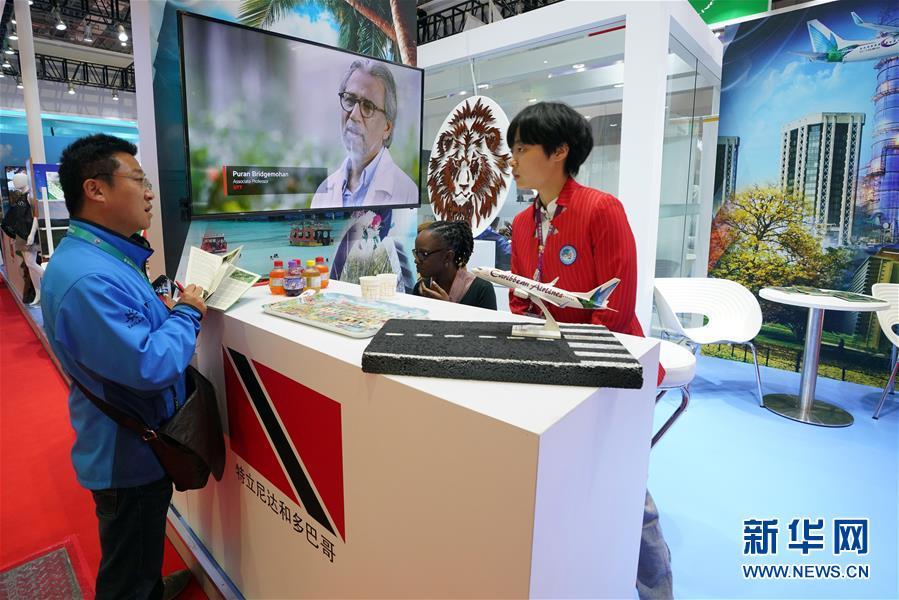 11月8日,在加勒比地區(qū)國家展區(qū)特立尼達和多巴哥展臺,一名參觀者(左)與工作人員交談。 中國國際進口博覽會11月5日在上海開幕。國家貿(mào)易投資綜合展(國家展)是中國國際進口博覽會的重要內(nèi)容,共有82個國家、3個國際組織設立71個展臺。 新華社記者 程麗 攝