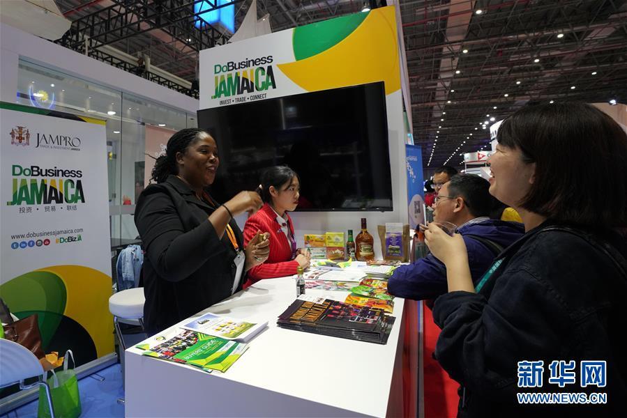 11月8日,在加勒比地區(qū)國家展區(qū)牙買加展臺,工作人員請參觀者品嘗本國特色食品。 中國國際進口博覽會11月5日在上海開幕。國家貿(mào)易投資綜合展(國家展)是中國國際進口博覽會的重要內(nèi)容,共有82個國家、3個國際組織設立71個展臺。 新華社記者 程麗 攝