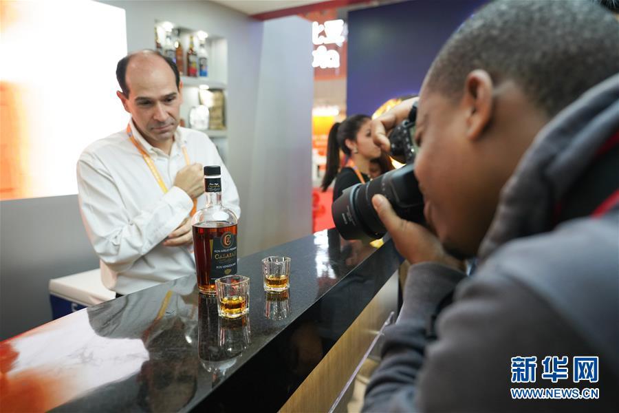 11月7日,在委內(nèi)瑞拉展區(qū),一名參觀者拍攝當?shù)厣a(chǎn)的朗姆酒。 中國國際進口博覽會11月5日在上海開幕。國家貿(mào)易投資綜合展(國家展)是中國國際進口博覽會的重要內(nèi)容,共有82個國家、3個國際組織設立71個展臺。 新華社記者 王天聰 攝