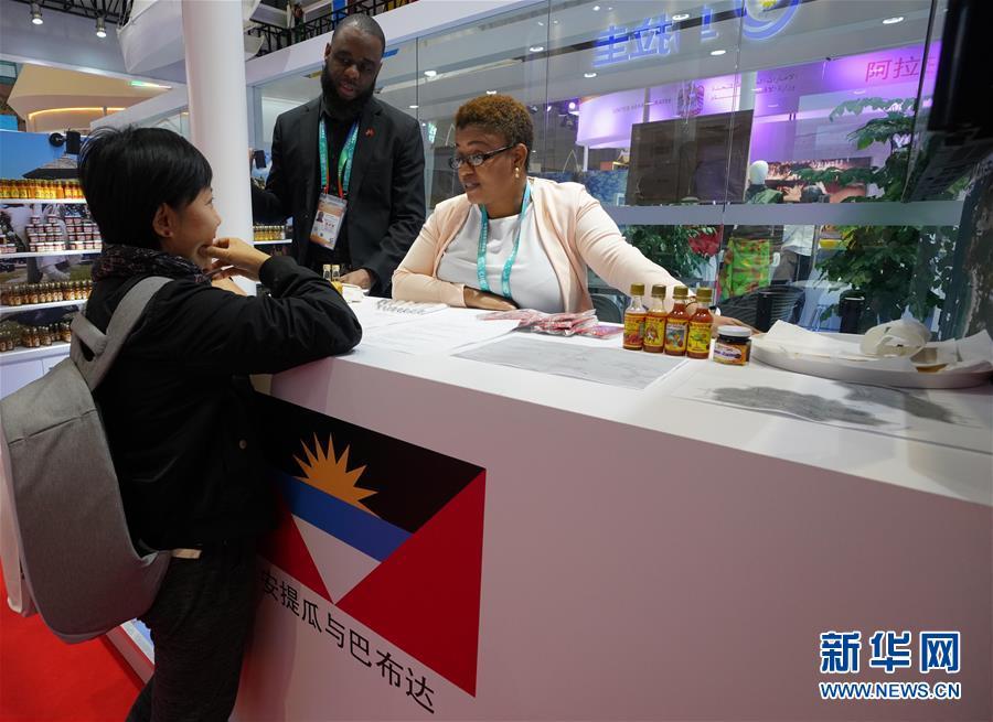 11月8日,在加勒比地區(qū)國家展區(qū)安提瓜和巴布達展臺,一名參觀者(左)與工作人員交談。 中國國際進口博覽會11月5日在上海開幕。國家貿(mào)易投資綜合展(國家展)是中國國際進口博覽會的重要內(nèi)容,共有82個國家、3個國際組織設立71個展臺。 新華社記者 程麗 攝