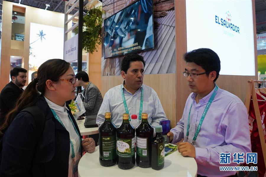 11月7日,在薩爾瓦多展區(qū),一名參觀者(左)聽取工作人員推介當?shù)厣a(chǎn)的諾麗果汁。 中國國際進口博覽會11月5日在上海開幕。國家貿(mào)易投資綜合展(國家展)是中國國際進口博覽會的重要內(nèi)容,共有82個國家、3個國際組織設立71個展臺。 新華社記者 王天聰 攝