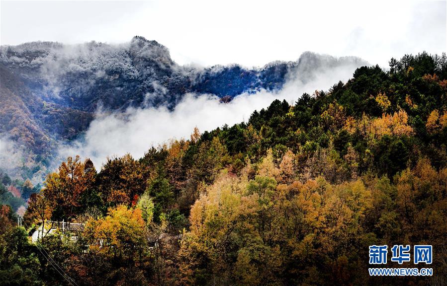 11月5日無人機拍攝的陜西省漢中市佛坪縣城旁的秦嶺景色。 新華社記者陶明攝