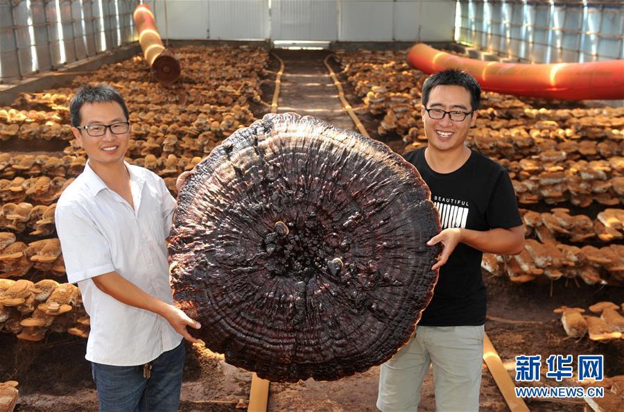 9月4日,韓子南(左)和韓子夜在展示他們培育出的直徑達1米的巨型靈芝。