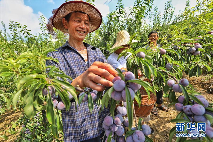 8月12日,平正鄉(xiāng)紅心村的一名果農(nóng)在采摘李子。 新華社記者 劉續(xù) 攝