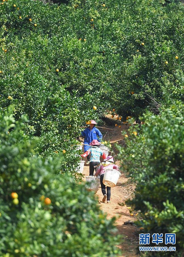 11月11日,江西省尋烏縣澄江鎮(zhèn)周田村的果農(nóng)在挑運臍橙。新華社記者 萬象 攝
