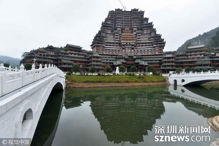 深圳新網(wǎng)網(wǎng)訊 始建于2016年9月的貴州省獨(dú)山縣水司樓已進(jìn)入工程收尾階段。雄偉壯麗造型別致的水司樓,是集會(huì)展博覽、酒店住宿、游覽觀光等于一體的大型綜合體。除具有水族特色元素外,該建筑還融合了苗族、布依族特色,是獨(dú)山縣凈心谷景區(qū)最具標(biāo)志性的宏大建筑。該樓占地面積5900平方米,總建筑面積60000平方米,樓高99.9米,共24層,是世界上最高大最大最壯觀的水族建筑,被稱為“天下第一水司樓”。 水司樓是按照水族依山畔水而居的傳統(tǒng)習(xí)俗和建筑特征修建,是水族人民的文化符號(hào)和智慧的象征,背靠?jī)粜暮庸壬郊?,以弧形的平面布局模式,如同張開(kāi)懷抱的巨人,緊擁美麗的姻脂河灣,設(shè)計(jì)巧妙,工藝精巧。