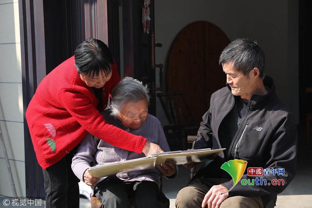 2018年10月31日,杭州,著名作家金庸的妹妹查良琇在浙江臨安家中翻看照片。