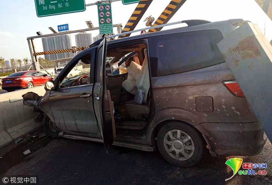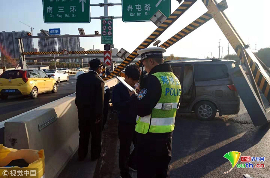2018年11月19日下午,鄭州市西三環(huán)化工路立交橋,沿西三環(huán)由北向南方向上橋口處,一輛商務面包車失控撞塌了3米限高架,橋上交通瞬間中斷。 圖片來源:視覺中國