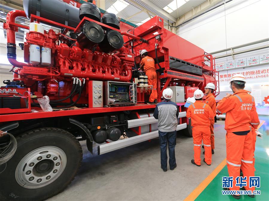 在杰瑞集團石油裝備制造工業(yè)園,工作人員在對壓裂車進行裝配(10月17日攝)。新華社記者王南攝