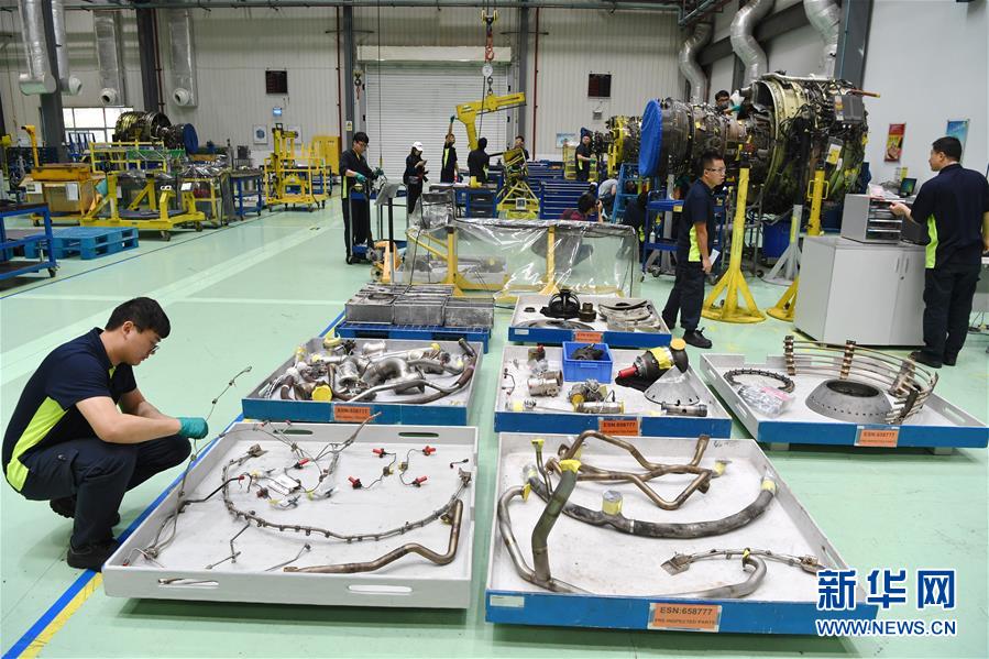11月15日,在福建自貿(mào)區(qū)廈門片區(qū)的新科宇航科技有限公司航空維修車間內(nèi),技術人員在拆解飛機發(fā)動機。新華社記者姜克紅攝
