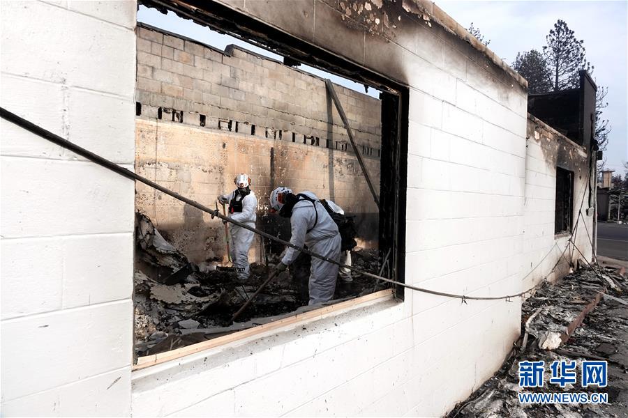 11月20日,在美國(guó)加利福尼亞州比尤特縣天堂鎮(zhèn),救援人員在山火廢墟中工作。