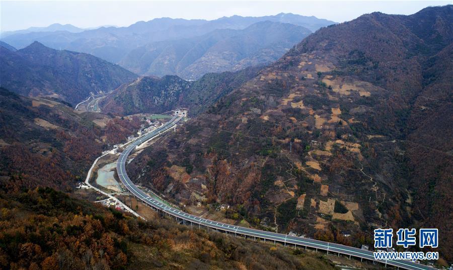 11月20日拍攝的水陽高速公路與包茂高速公路相接的樞紐互通式立交(無人機(jī)拍攝)。 近日,記者從陜西省交通建設(shè)集團(tuán)公司了解到,陜西柞水至山陽高速公路已全線貫通即將通車。據(jù)介紹,(柞)水(山)陽高速公路全長78.8公里,開通后將實(shí)現(xiàn)包茂高速、福銀高速在陜南商洛地區(qū)的連接,開辟出秦嶺南麓的一條橫向高速大通道,對(duì)完善陜西高速公路路網(wǎng)結(jié)構(gòu)、促進(jìn)陜南區(qū)域經(jīng)濟(jì)發(fā)展、加快山區(qū)群眾脫貧致富具有重要意義。 新華社記者劉瀟攝