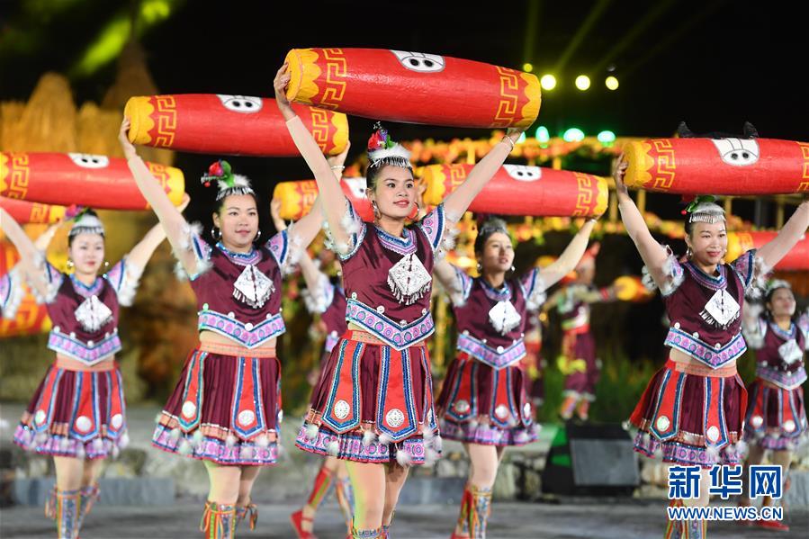 11月21日,演員表演舞蹈《天鼓神韻》。 當(dāng)日,廣西柳州市第一屆旅游產(chǎn)業(yè)發(fā)展大會暨2018第十八屆中國·融水苗族蘆笙斗馬節(jié)開幕式晚會在融水苗族自治縣舉行。 新華社記者 周華 攝