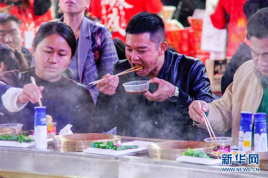 10月19日,食客們圍坐在一口特大火鍋前品嘗。 當(dāng)日,第十屆中國(重慶)火鍋美食文化節(jié)在重慶市江北區(qū)正式開幕。本屆火鍋美食文化節(jié)為期4天,以“麻辣happy城市節(jié)日”為主題,50000平方米的展區(qū)吸引了70余個火鍋品牌、300余家火鍋供應(yīng)鏈企業(yè)參展,萬人同燙火鍋的盛況在“火鍋之都”重慶再現(xiàn)。 新華社記者 劉潺 攝
