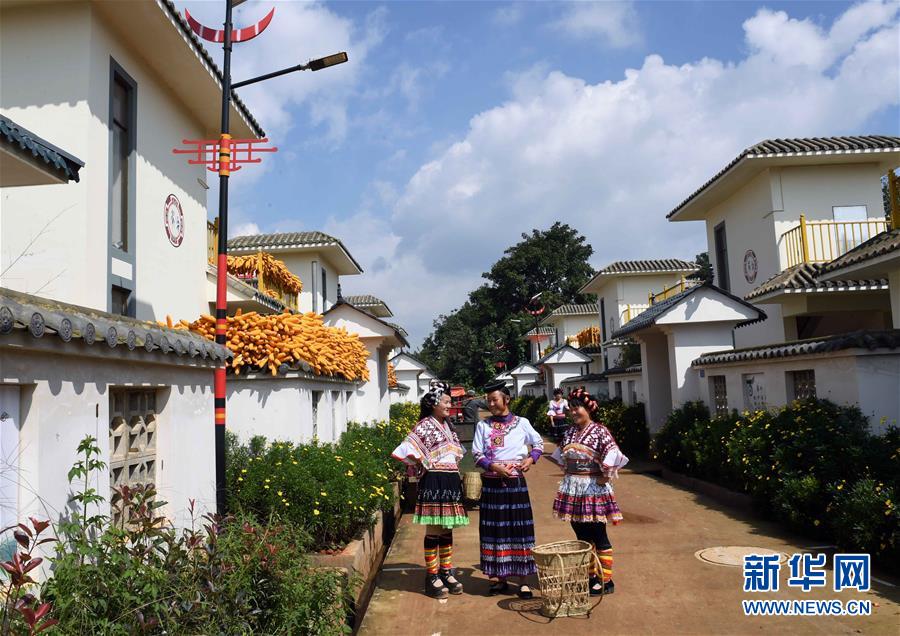 10月6日,在尋甸回族彝族自治縣塘子街道小海村,幾名婦女在新居前聊天。國慶節(jié)期間,云南省尋甸回族彝族自治縣塘子街道小海村一片喜慶祥和。人們身著節(jié)日盛裝,載歌載舞,歡慶搬入新居后的第一個國慶節(jié)。新華社記者楊宗友攝