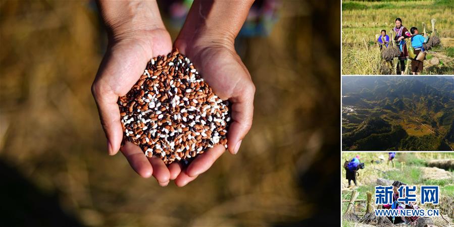 拼版照片:左圖為在安太鄉(xiāng)元寶村,合作社負(fù)責(zé)人謝秀萍手捧今年收獲的三色香糯;右上圖為合作社負(fù)責(zé)人謝秀萍(中)和社員們?cè)谑障闩矗挥抑袌D為位于苗山深處的香糯種植基地;右下圖為謝秀萍在收香糯(照片均攝于10月30日)。謝秀萍是當(dāng)?shù)叵闩捶N植合作社負(fù)責(zé)人,帶動(dòng)幾百戶(hù)貧困戶(hù)種植香糯。香糯是廣西融水大苗山的特產(chǎn),它生長(zhǎng)在高寒高海拔的特殊自然環(huán)境中,產(chǎn)量少,營(yíng)養(yǎng)價(jià)值高。 廣西融水苗族自治縣是國(guó)家扶貧工作重點(diǎn)縣,全縣“九山半水半分田”,生活生產(chǎn)環(huán)境較為惡劣,脫貧攻堅(jiān)任務(wù)艱巨,目前還有7.68萬(wàn)貧困人口。面對(duì)經(jīng)濟(jì)發(fā)展落后、貧困面廣且程度深的現(xiàn)狀,當(dāng)?shù)匕衙撠毠?jiān)與創(chuàng)新產(chǎn)業(yè)扶持相結(jié)合,依托生態(tài)資源優(yōu)勢(shì),實(shí)施“特色產(chǎn)業(yè)富民行動(dòng)”,通過(guò)發(fā)展特色民族旅游、林下經(jīng)濟(jì)和特色養(yǎng)殖業(yè)等扶貧產(chǎn)業(yè),帶動(dòng)貧困群眾依靠勤勞的雙手,拔窮根摘窮帽,實(shí)現(xiàn)脫貧致富。據(jù)了解,目前全縣貧困戶(hù)參與特色產(chǎn)業(yè)發(fā)展的有2.9萬(wàn)戶(hù),扶貧產(chǎn)業(yè)覆蓋率達(dá)95%。 新華社記者 黃孝邦 攝