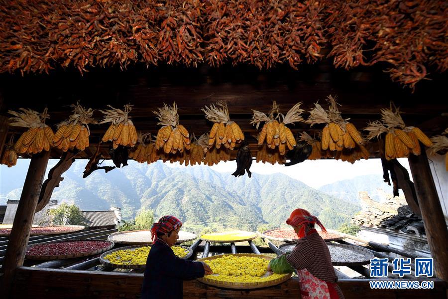 2017年10月26日拍攝的篁嶺古村。家家戶(hù)戶(hù)晾曬各種蔬果及皇菊。近日天氣晴朗,江西省婺源縣江灣鎮(zhèn)篁嶺村村民抓住時(shí)機(jī)采摘、晾曬皇菊及蔬果。明黃的菊花、火紅的辣椒……各種顏色將篁嶺古村裝扮成巨大的“調(diào)色板”,引來(lái)眾多游客感受鄉(xiāng)村美景。新華社記者宋振平 攝
