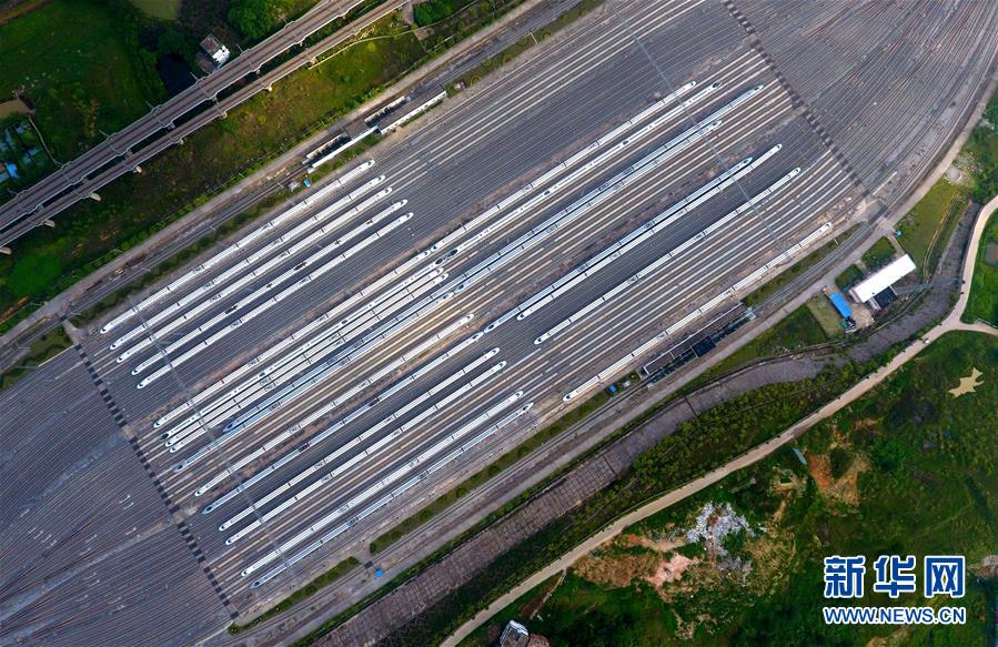 這是廣西南寧動(dòng)車(chē)所內(nèi)準(zhǔn)備發(fā)往各地的動(dòng)車(chē)組列車(chē)(7月1日無(wú)人機(jī)拍攝)。 廣西壯族自治區(qū)成立60年來(lái),鐵路建設(shè)發(fā)生翻天覆地的變化。來(lái)自中國(guó)鐵路南寧局集團(tuán)有限公司的數(shù)據(jù)顯示,1958年廣西鐵路總里程為1346.3公里,如今廣西鐵路總里程達(dá)5191公里。廣西與周邊相鄰省份間實(shí)現(xiàn)動(dòng)車(chē)“公交化”開(kāi)行。此外,北部灣港—重慶班列、東盟海產(chǎn)品冷鏈班列、“百色一號(hào)”果蔬專(zhuān)列等的開(kāi)通和運(yùn)營(yíng),強(qiáng)化了鐵路供給的針對(duì)性和有效性。鐵路成為助推廣西經(jīng)濟(jì)社會(huì)快速發(fā)展的“大動(dòng)脈”。 新華社記者黃孝邦攝