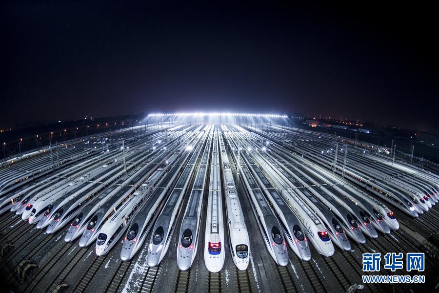 2018年2月1日凌晨,動(dòng)車(chē)組??吭谖錆h動(dòng)車(chē)段的存車(chē)線上,準(zhǔn)備進(jìn)行檢修和保溫作業(yè)。近百組在武漢動(dòng)車(chē)段經(jīng)過(guò)檢修、保溫作業(yè)的動(dòng)車(chē)組蓄勢(shì)待發(fā),迎接春運(yùn)。新華社記者 肖藝九 攝