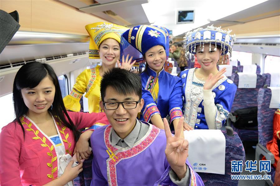 在廣西南寧站,身著民族服裝的乘客搭乘動(dòng)車(chē)準(zhǔn)備出行(2013年12月30日攝)。 廣西壯族自治區(qū)成立60年來(lái),鐵路建設(shè)發(fā)生翻天覆地的變化。來(lái)自中國(guó)鐵路南寧局集團(tuán)有限公司的數(shù)據(jù)顯示,1958年廣西鐵路總里程為1346.3公里,如今廣西鐵路總里程達(dá)5191公里。廣西與周邊相鄰省份間實(shí)現(xiàn)動(dòng)車(chē)“公交化”開(kāi)行。此外,北部灣港—重慶班列、東盟海產(chǎn)品冷鏈班列、“百色一號(hào)”果蔬專(zhuān)列等的開(kāi)通和運(yùn)營(yíng),強(qiáng)化了鐵路供給的針對(duì)性和有效性。鐵路成為助推廣西經(jīng)濟(jì)社會(huì)快速發(fā)展的“大動(dòng)脈”。 新華社記者周華攝