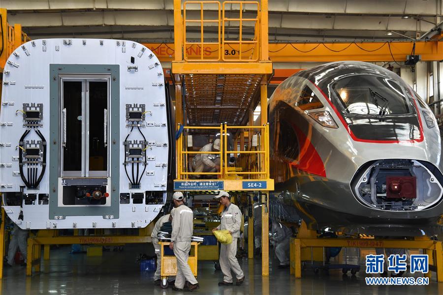 2018年5月10日,“復(fù)興號(hào)”動(dòng)車(chē)組在總裝生產(chǎn)線上裝配。新華社記者 李紫恒 攝