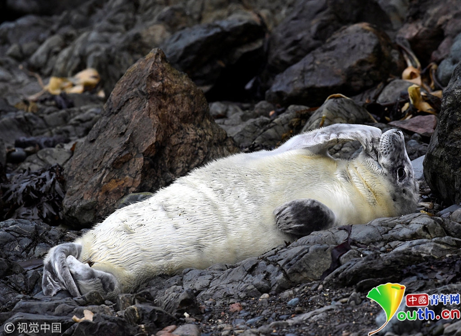 中國青年網(wǎng)北京10月9日電 當(dāng)?shù)貢r間2018年10月8日,英國彭布羅克郡,一只大西洋海豹幼崽躺在海邊礁石上。海豹幼崽出生時都有毛茸茸的白色非防水皮毛,它們會在第四周蛻皮。