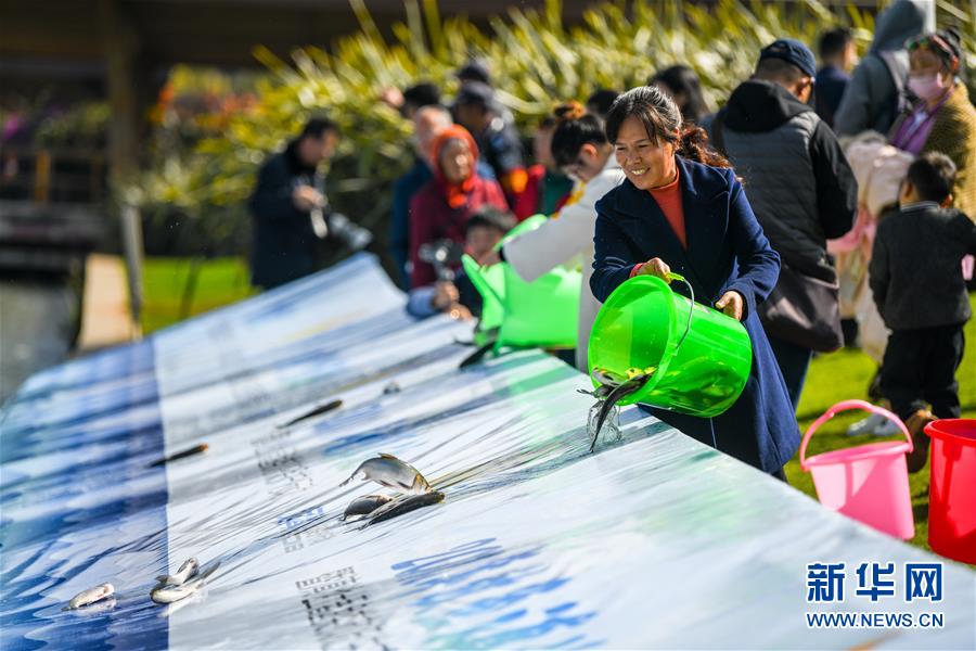 11月23日,市民在活動現(xiàn)場投放魚苗。 新華社記者江文耀攝