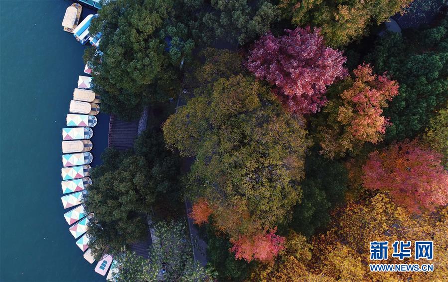 一排游船停泊在湖南烈士公園年嘉湖湖畔(11月25日無人機(jī)拍攝)。 新華社記者 李尕攝