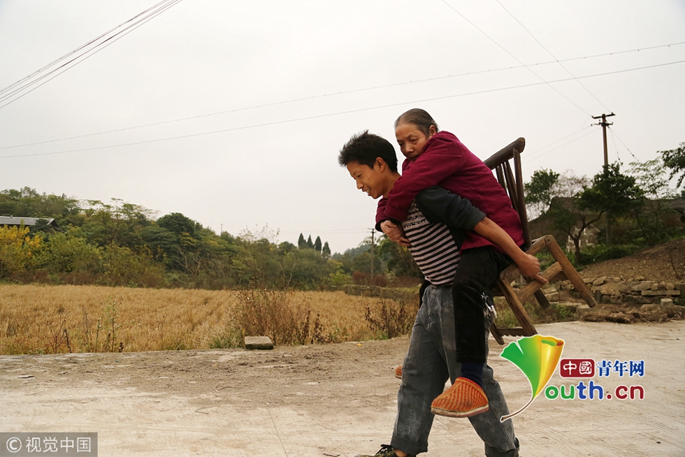 37歲的王顯強(qiáng),家在重慶市綦江區(qū)永新鎮(zhèn)伏牛村。23年前,王顯強(qiáng)的母親田井貴意外摔倒導(dǎo)致全身癱瘓,吃喝拉撒全由王顯強(qiáng)的父親照顧。2003年,王顯強(qiáng)的父親去世,深受打擊的田井貴從此開(kāi)始不再和外人說(shuō)話(huà)。“我媽就是我的全部!”原本在浙江打工的王顯強(qiáng)回到家里,為了養(yǎng)活自己和母親,他決定背著母親到重慶主城打工。從此,身材不高的王顯強(qiáng),用自己不算厚實(shí)的后背,讓母親有了新的依靠。