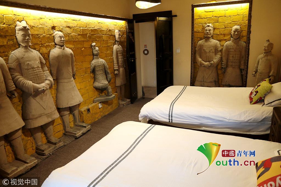 2018年11月27日,西安,民宿臥室內(nèi)的“兵馬俑”裝飾。近日,西安一家主打“兵馬俑”元素的民宿走紅,“兵馬俑”元素遍布在房間各個角落,“深情注視”著在此休憩的旅客,加上昏黃的燈光及復(fù)古的裝飾,讓不少旅客感嘆如同居住在“秦始皇陵”。 張遠(陜西分社)/視覺中國