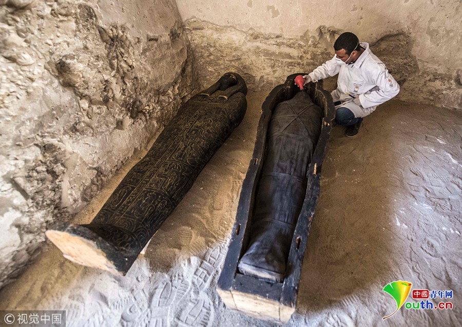 當(dāng)?shù)貢r(shí)間2018年11月24日,埃及盧克索,考古學(xué)家在當(dāng)?shù)匕l(fā)掘出一處墓穴,在其中發(fā)現(xiàn)石棺、木乃伊等文物,時(shí)間可追溯至公元前4-7世紀(jì)。