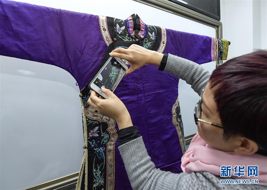 11月30日,在北京服裝學(xué)院,一名學(xué)生在拍攝清代女性服裝的細(xì)節(jié)。 新華社記者李賀攝