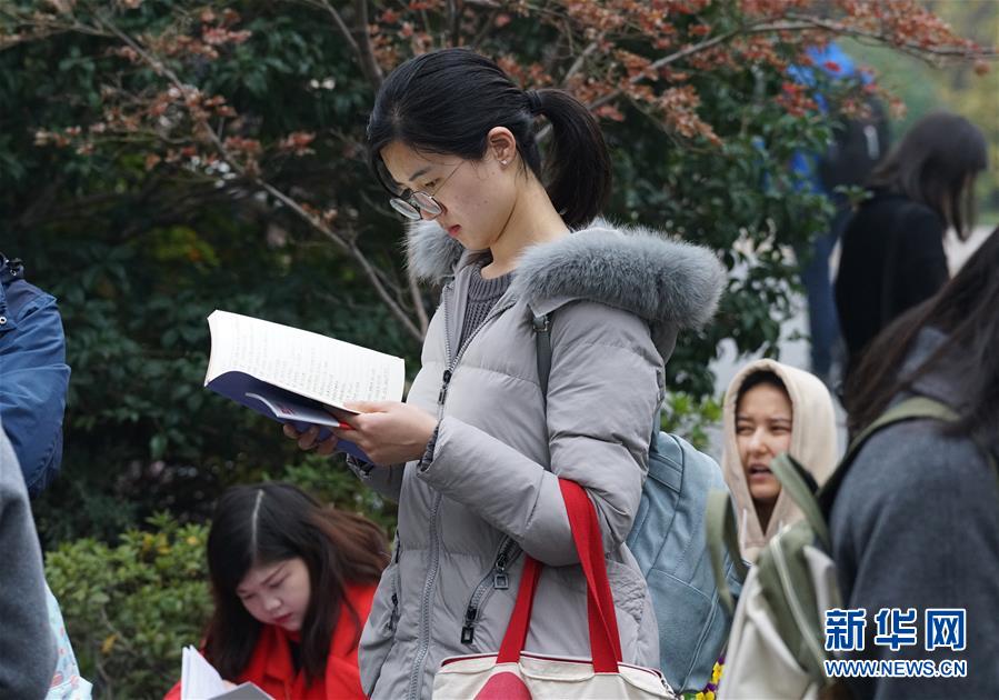 12月2日,在南京林業(yè)大學考點,一名考生在等候進場時復習。 新華社記者 孫參 攝