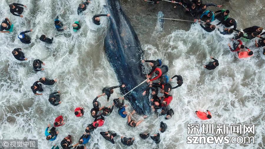 當?shù)貢r間2018年4月9日,阿根廷馬德普拉塔,一條鯨魚在當?shù)睾R淺,雖經(jīng)民眾合力救助仍最終死亡。