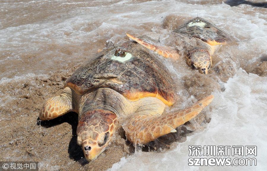 韓國水產(chǎn)部門舉辦海龜放生儀式 海龜背“天線”重歸大海