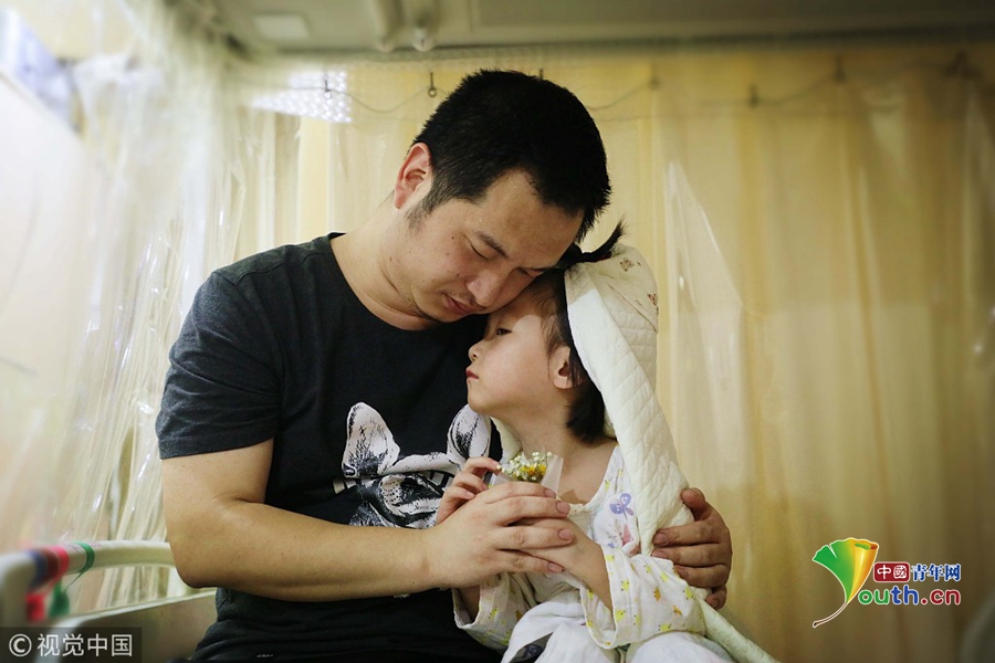 中國青年網(wǎng)北京12月3日電2018年11月17日,在北京博仁醫(yī)院病房內(nèi),4歲的小婭馨披著一條象征著婚紗的毯子坐在床上,爸爸袁東方雙手捧著一束小小的假鮮花單膝跪地向女兒“求婚”,隨后,父女倆緊緊地擁抱在一起,顯得既幸福又傷感。旁邊的小婭馨媽媽抹著眼淚抽泣著說“我女兒未必明白結(jié)婚寓意著什么,但她真的好想健康地活著!她是那么天真無邪,又那么懂事可愛,我們真舍不得丟下她不管,祈求社會上的好心人幫幫我們,救救我心愛的女兒吧!”。