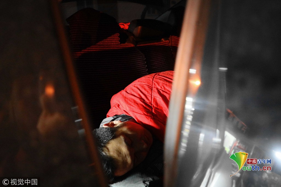 2018年11月17日,北京,由于醫(yī)院只允許一名家長(zhǎng)陪護(hù),醫(yī)院門口的日租房又很貴,袁東方不舍得花錢,只好借住在病友的車內(nèi)。魏建順/視覺(jué)中國(guó)