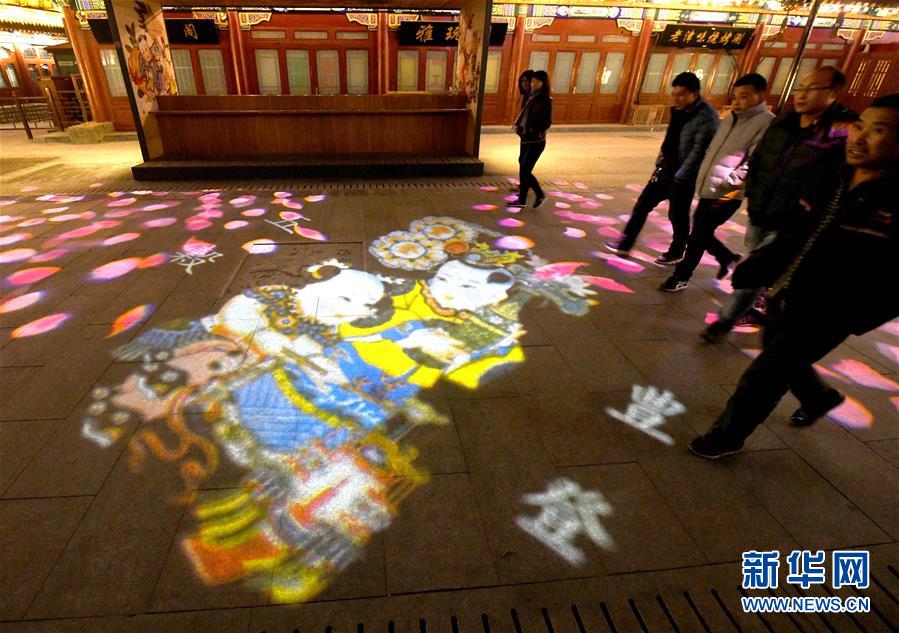 12月4日,游客在楊柳青古鎮(zhèn)步行街上欣賞年畫主題燈光。 近日,天津市西青區(qū)楊柳青古鎮(zhèn)在步行街新增9組以楊柳青年畫代表作為主題的動(dòng)態(tài)夜景燈光,講述古鎮(zhèn)與年畫的歷史。 新華社記者 岳月偉 攝