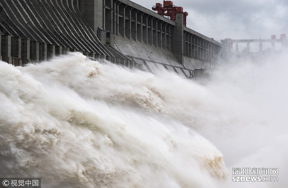 2018年7月5日,湖北宜昌,江水通過三峽大壩泄洪深孔下泄。