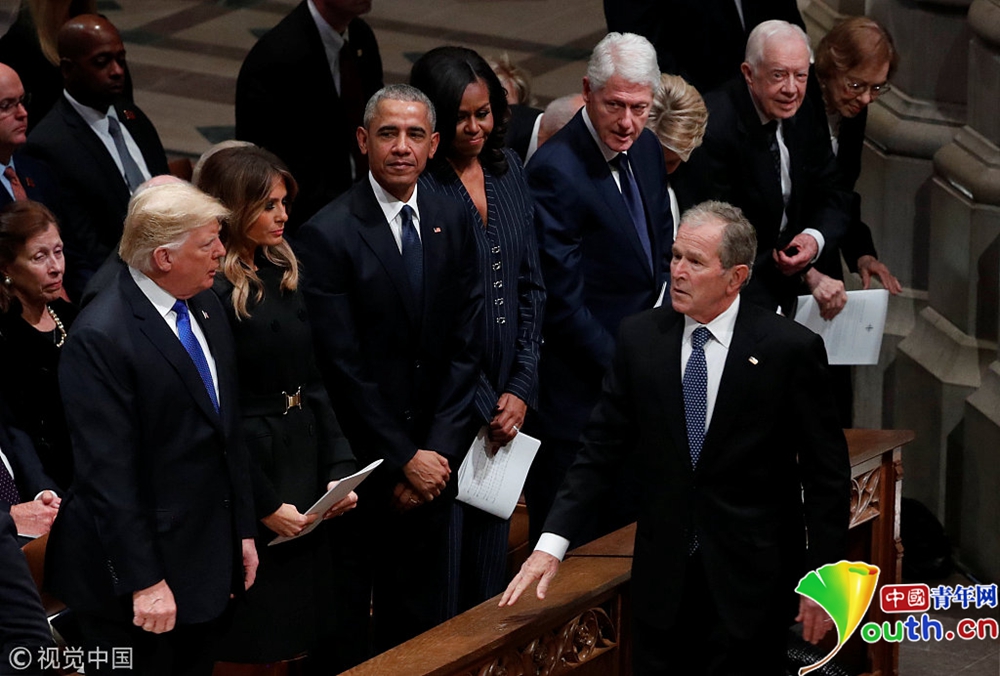 小布什走向第一排向總統(tǒng)及前總統(tǒng)們致敬。