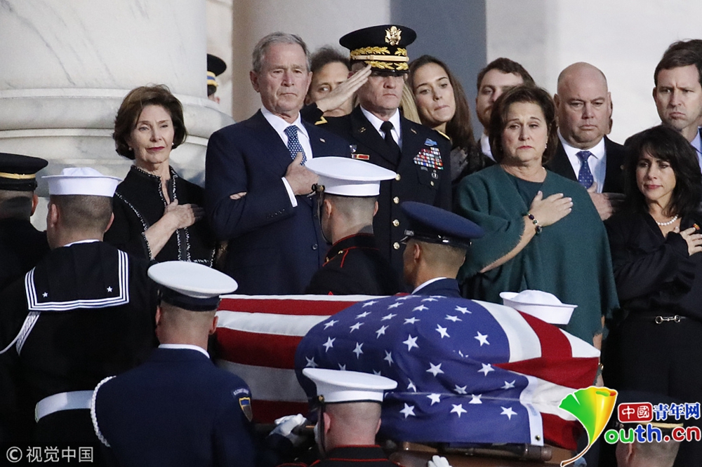 美國第41任總統(tǒng)喬治·赫伯特·沃克·布什(老布什)的靈柩從他的家鄉(xiāng)休斯頓運(yùn)抵首都華盛頓市郊,他的遺體將從當(dāng)天晚上開始放于國會圓形大廳,供民眾瞻仰。